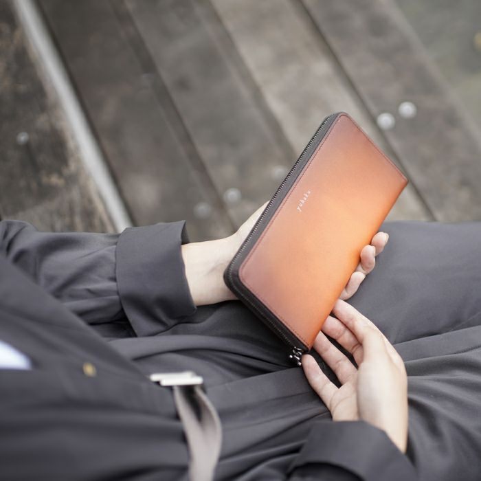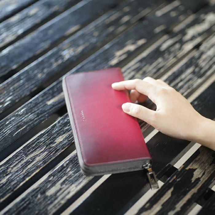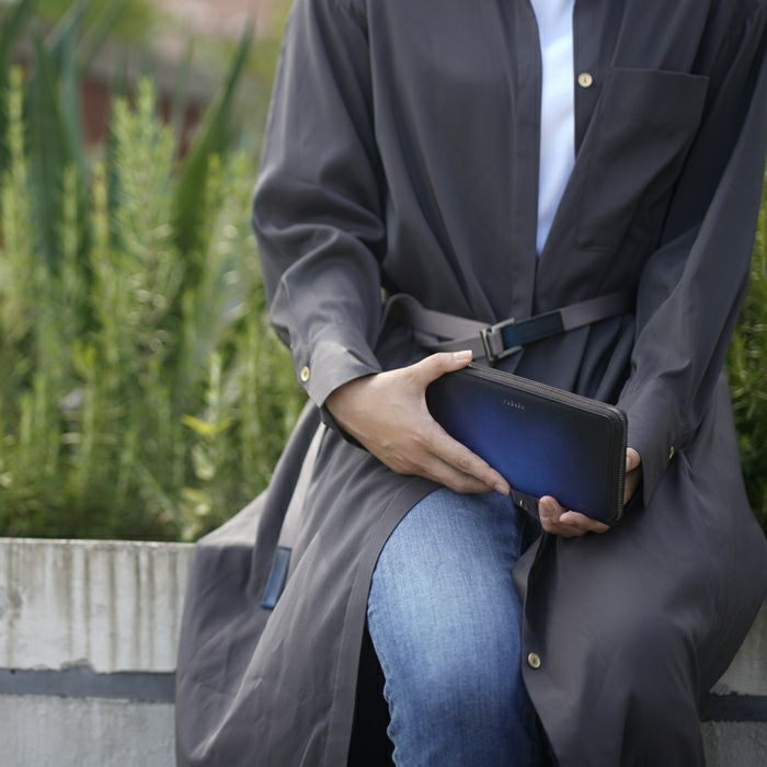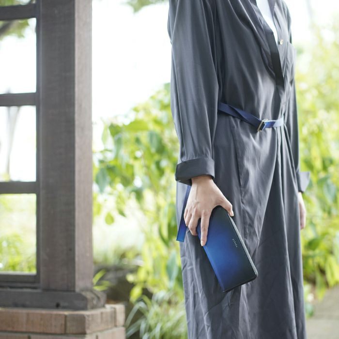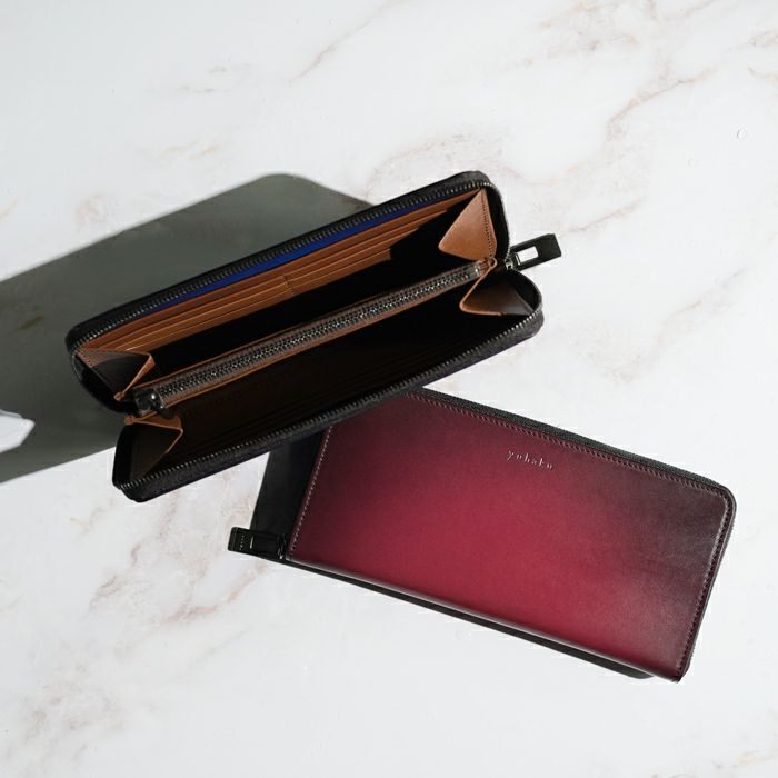 yuhakuの職人が感覚と技術を駆使して仕上げる手染めをベースに、美しさの維持と撥水性を持たせるためインクジェットプリントを研究し幾度にも及ぶテストの末に生まれたグラデーションレザーです。手染めの緻密なムラまで忠実に再現しており、yuhaku独自の美しさと機能の両立を実現させています。