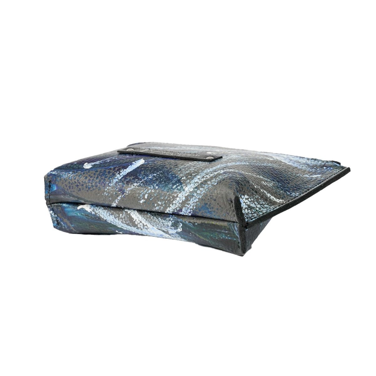下描きを用いず、アクリル絵の具の彩りとヘラの筆致のみで、革の向こう側に見える心象風景を描きました。