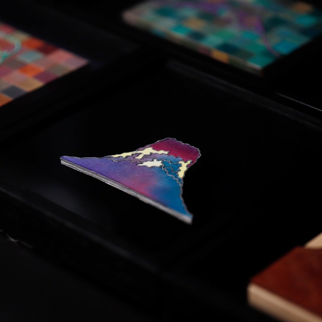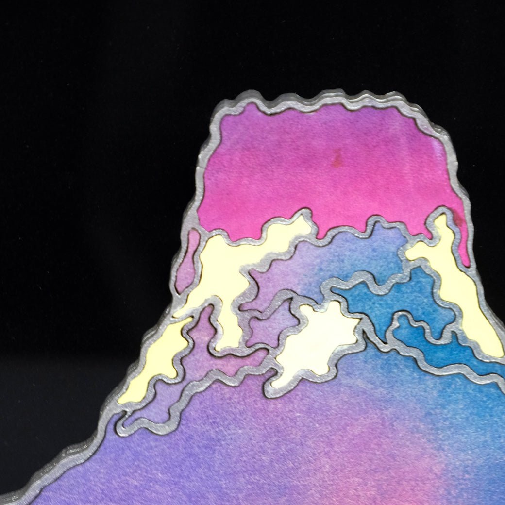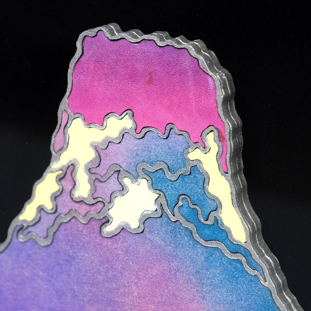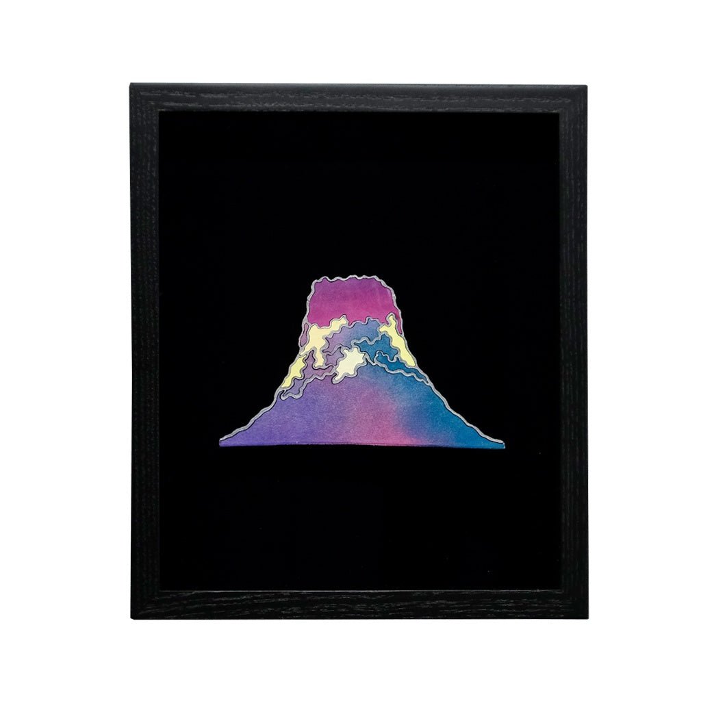 本コラボレーションのために描き下ろしした招福シリーズの「富士山」を、yuhakuの職人たちが制作したグラデーションレザーのピースで彩りました。