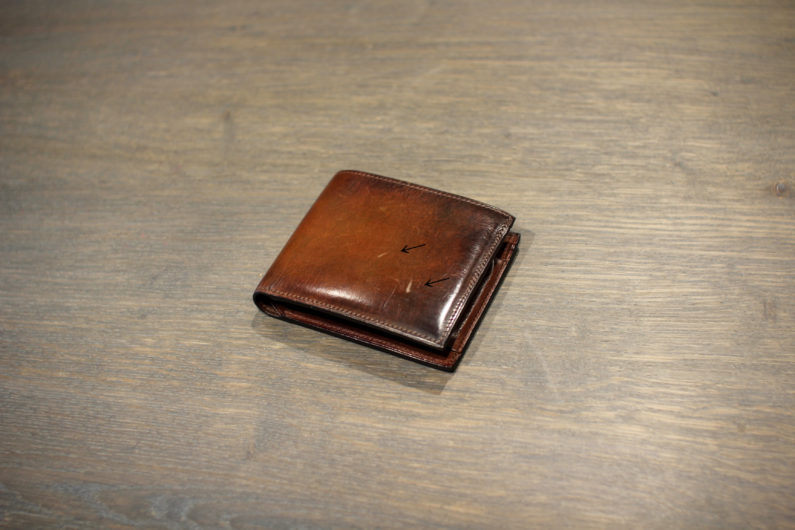 革の表面がえぐれてしまうとその補修は難しいですが、浅い傷であれば乾いた布と革用クリームを用いて正しくケアすることでその傷は目立たなくなります。