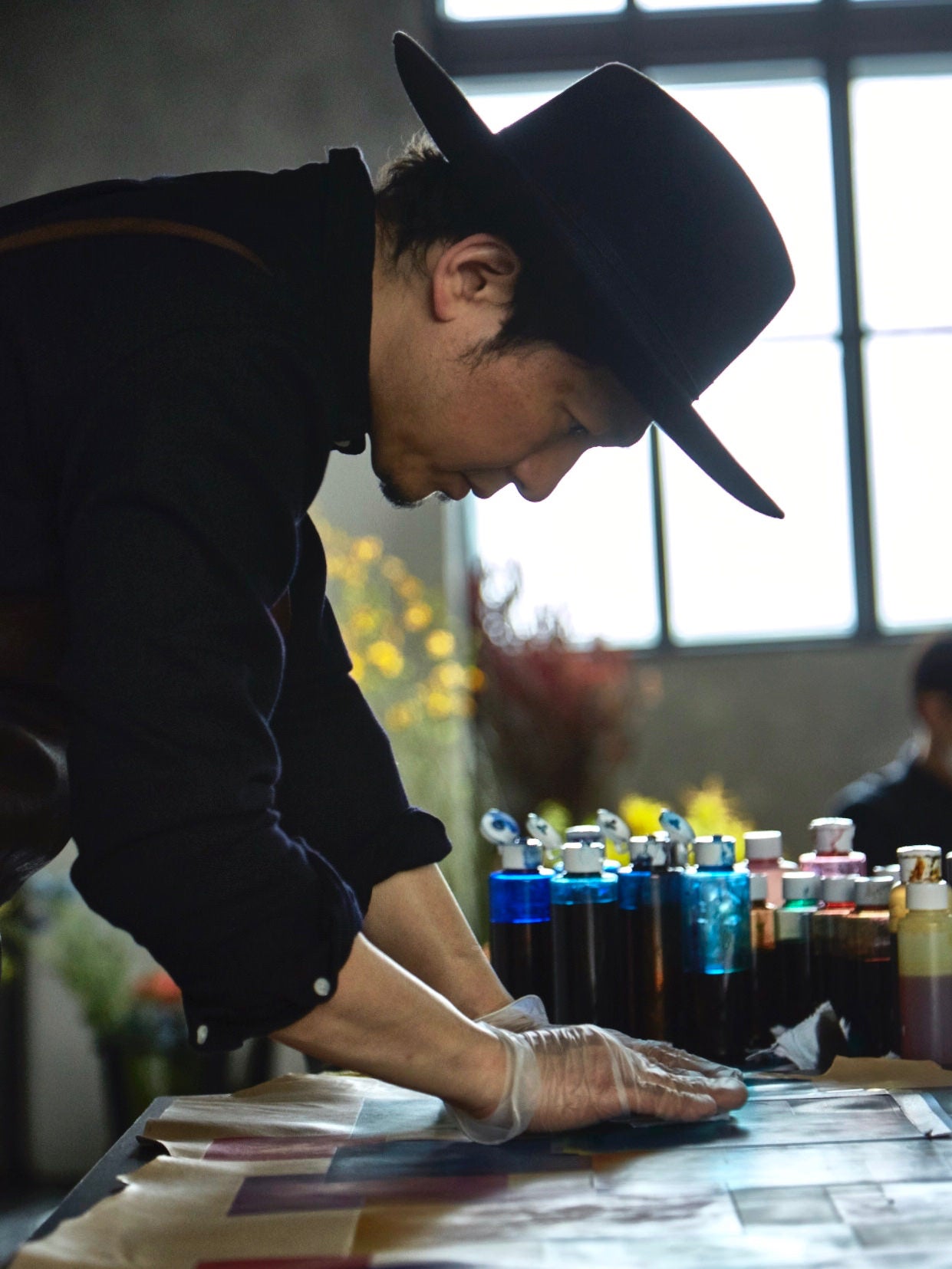 仲垣氏が長年にわたって行ってきた絵画制作の技術をもとに、研究を重ねて完成させたのが「yuhaku」の手染め技術。革を染めながら、色を重ねていくこの技法は世界でも類を見ない独自のものだ。